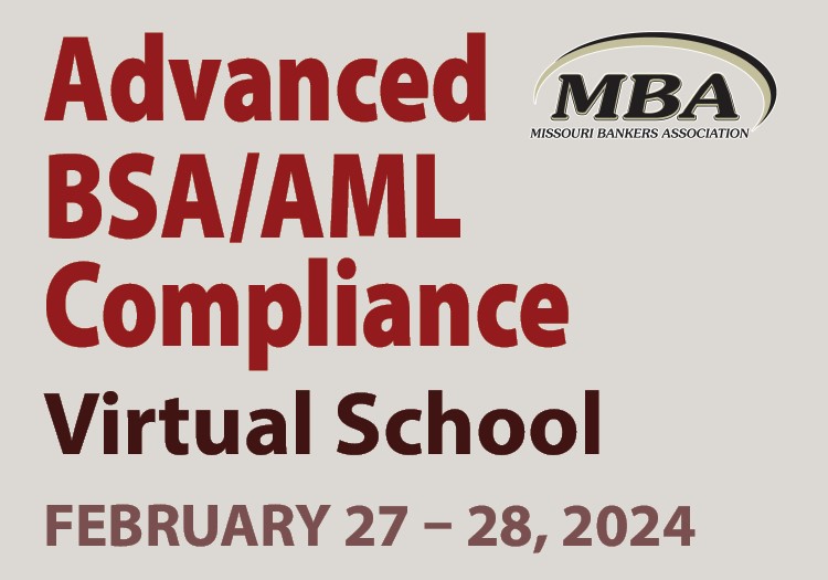 To meet the ongoing regulatory requirements, Missouri Bankers Association is pleased to offer the Advanced BSA/AML/CFT Compliance Program. This two-day program focuses on the latest changing BSA/AML/CFT Compliance arena and offers tips and tools to develop and manage an “adequate” and “an effective and reasonably designed” BSA program. This program also assists financial institutions in meeting the annual training requirements by the BSA regulations.