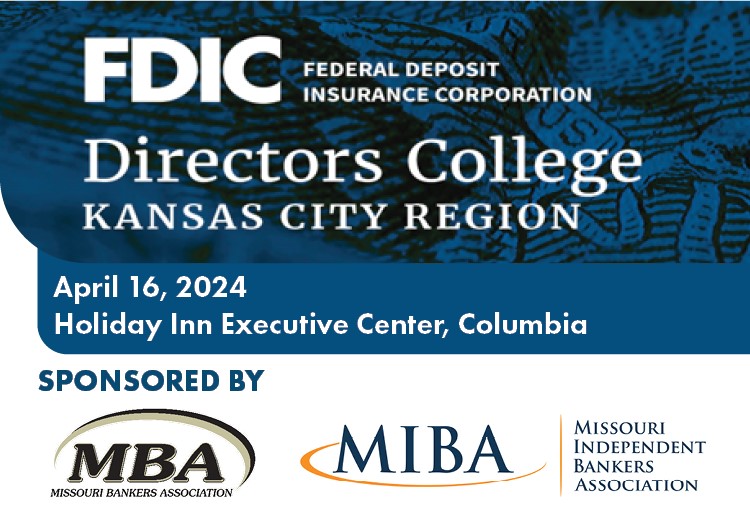 The FDIC, in partnership with Missouri Bankers Association and Missouri Independent Bankers Association, is pleased to announce the 2024 Directors College. This one-day seminar is designed with bank directors in mind. The presentations will be delivered by a group of FDIC subject matter experts and will include up-to-date information on issues relevant to all bank directors, with an overall theme of corporate governance. As you finalize your training plans, please consider this unique opportunity to interact with your bank’s regulators and enhance your board’s experience and knowledge.